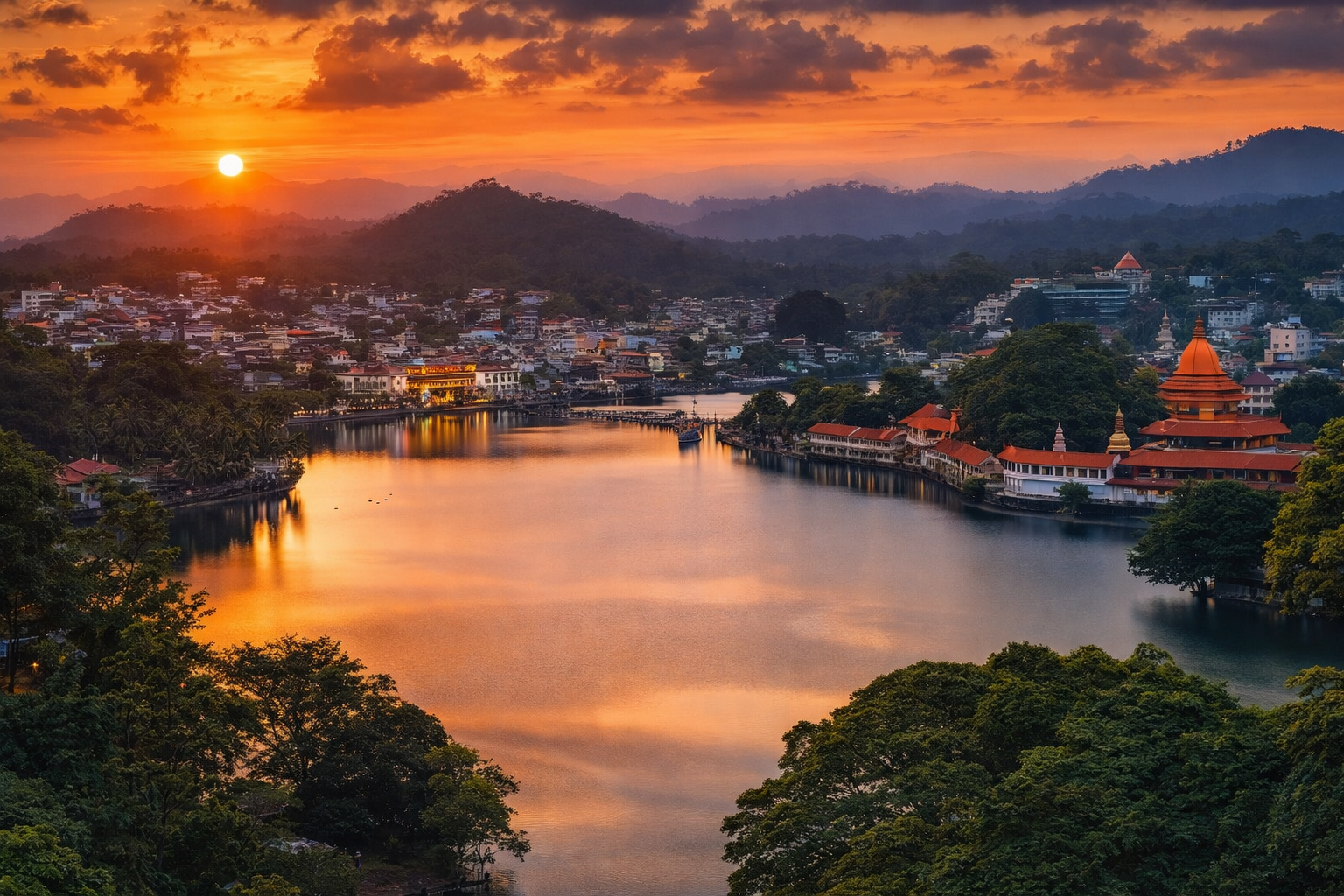 Kandy is Sri Lanka’s cultural heart of the hill country—famous for its sacred Temple of the Tooth Relic, a peaceful lake walk, and green highland landscapes just beyond the city. Once the last royal capital of the Sinhala kings, Kandy still feels ceremonial and alive: you’ll hear drums and chanting near the temple, smell jasmine and incense in the evenings, and find viewpoints, forests, and tea-growing hills a short drive away.
